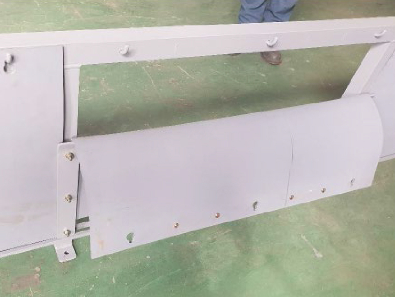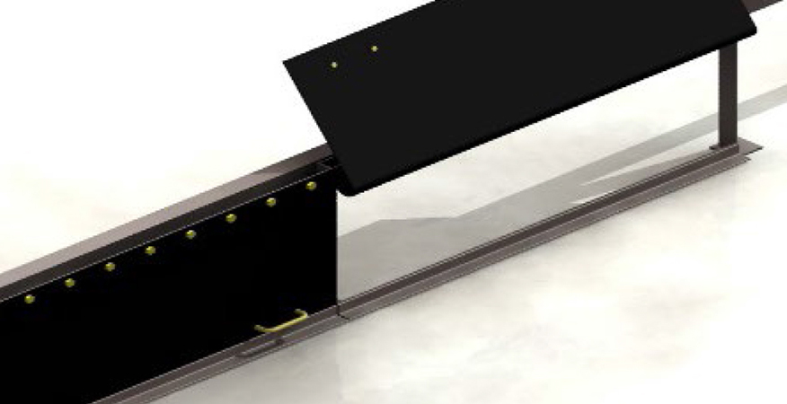 고무소재로 된 Rubber Cover Plate가 Frame에 고정되어 Conveyor Line의 점검 및 Roller 교체 및 청소 등 정비작업 필요 시 Rubber Cover Plate들어 올려 손잡이를 별도의 걸이장치에 걸어 놓고 Line 관리